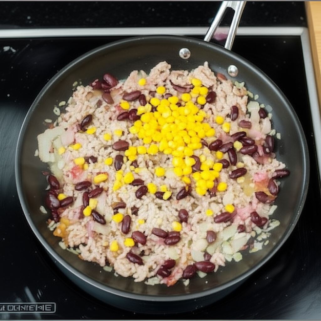 Fasolę i kukurydzę odcedź oraz opłucz wodą. Wsyp do mięsa.
