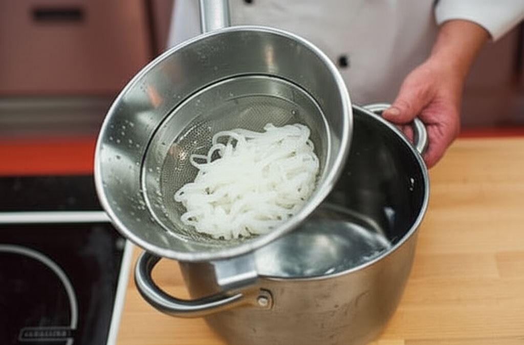 W garnku doprowadź do wrzenia około 500 ml wody, potem dodaj makaron i trzymaj pod pokrywką przez 3 minuty. Po upływie tego czasu odcedź go.