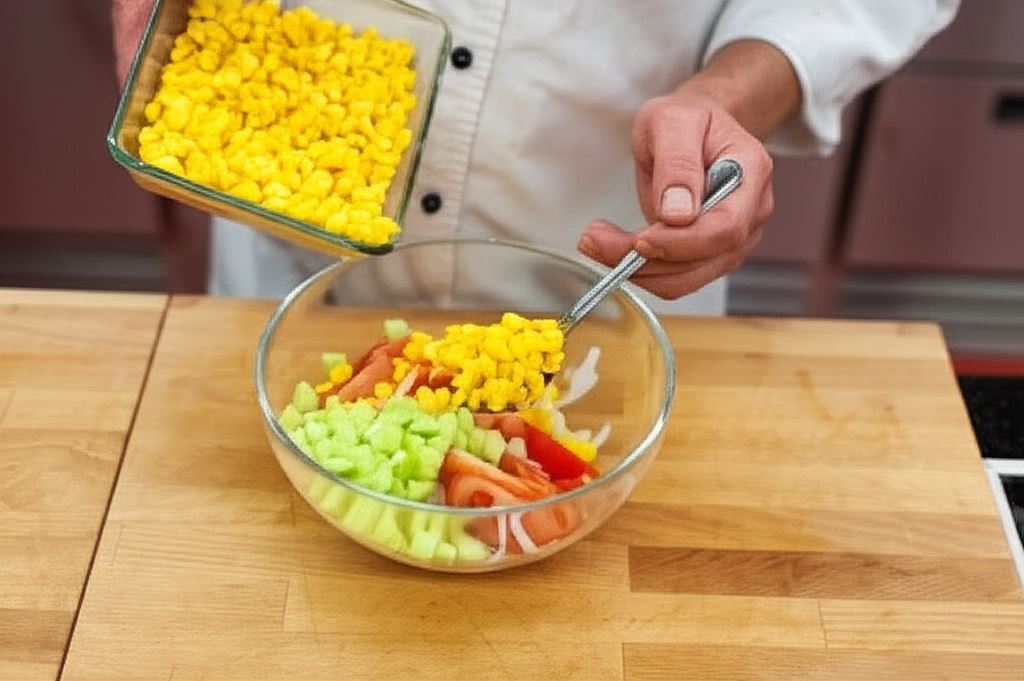 W misce wymieszaj makaron pocięty na krótsze nitki, pomidory pokrojone w cząstki, ogórki w kostkę i odcedzoną kukurydzę.