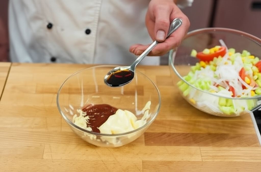 Wymieszaj Majonez Babuni Hellmann's z Ketchupem Hellmann's Łagodnym, sosem sojowym oraz zmiażdżonym czosnkiem.