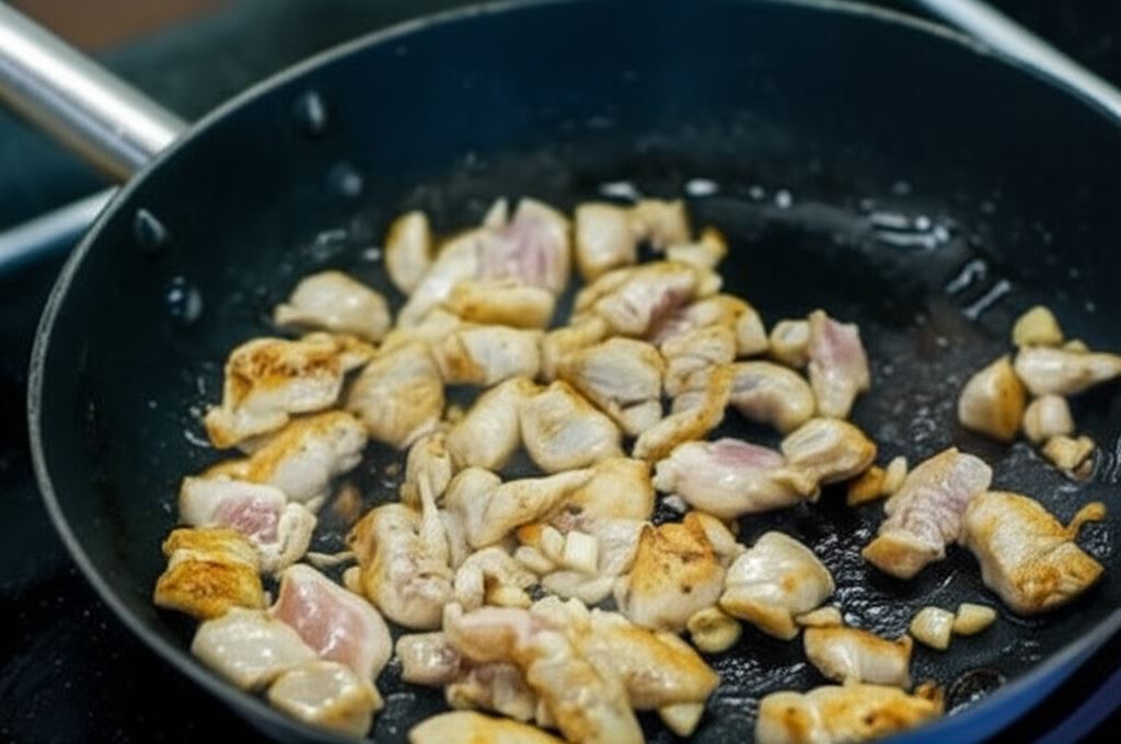 Kurczaka potnij w małą kostkę i dopraw rozdrobnionym czosnkiem i suszonym imbirem. Potem zrumień na oleju.