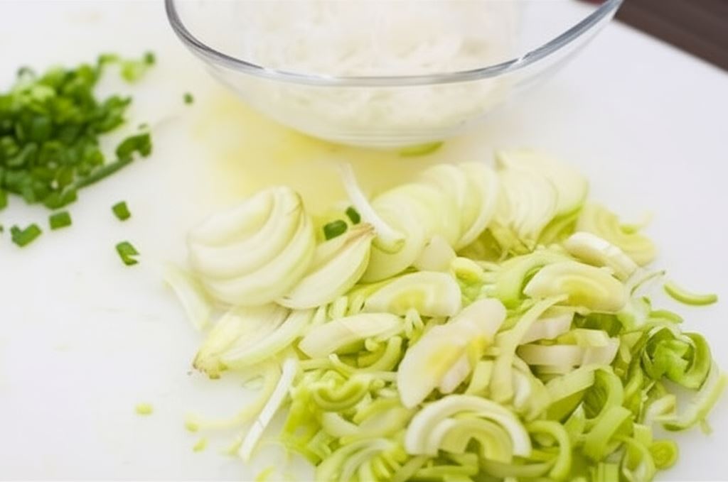 Pora potnij w paski, cebulę w piórka, a szczypiorek drobno posiekaj. Makaron zalej wrzącą wodą, by zmiękł.