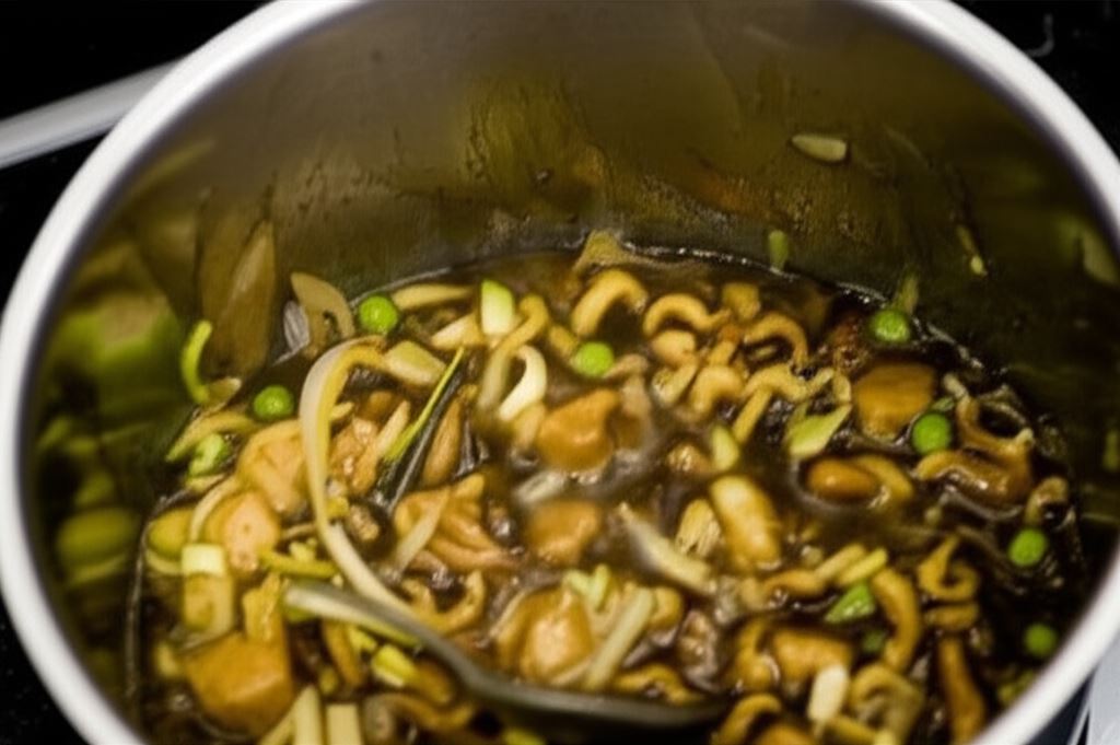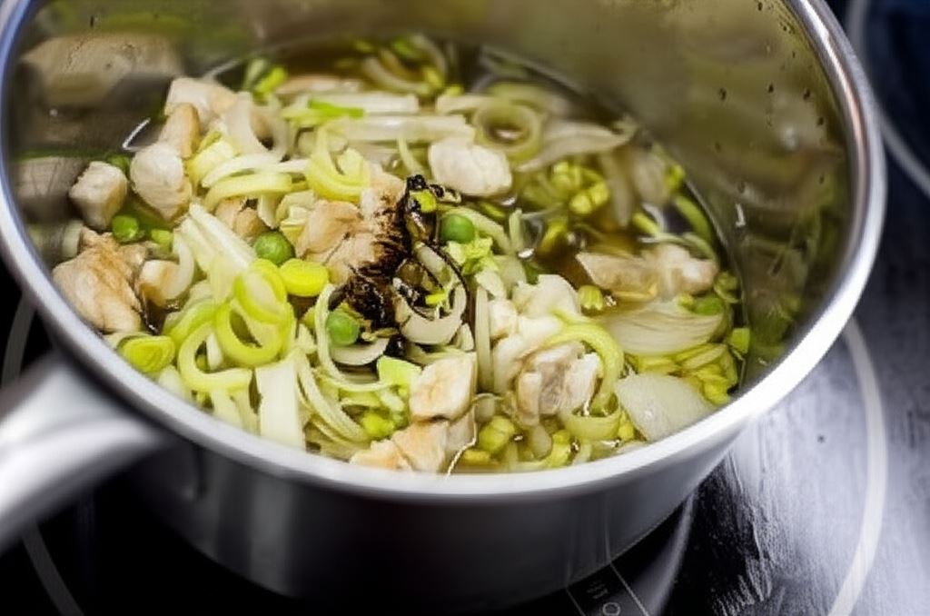 Do wywaru wrzuć kurczaka, pora, groszek, cebulę i sos sojowy.
