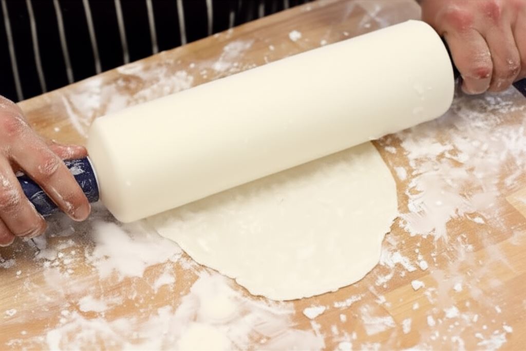 Posyp powierzchnię stolnicy mąką ziemniaczaną, uformuj kawałek ciasta w dłoniach w małą kulkę, po czym starannie rozwałkuj na bardzo cienki placek o średnicy około 10 cm. Każdy uzyskany placek lekko posmaruj z wierzchu olejem.