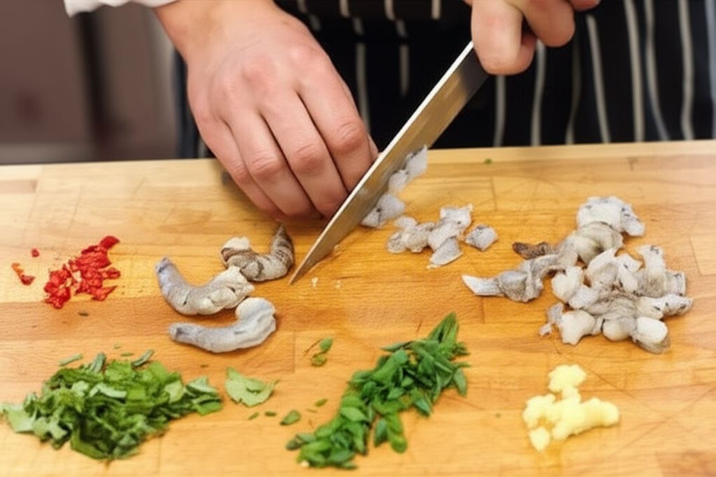Krewetki posiekaj na bardzo małe kawałeczki przy pomocy noża, posiekaj też kolendrę, szczypior i ostrą papryczkę. Imbir zetrzyj na tarce.