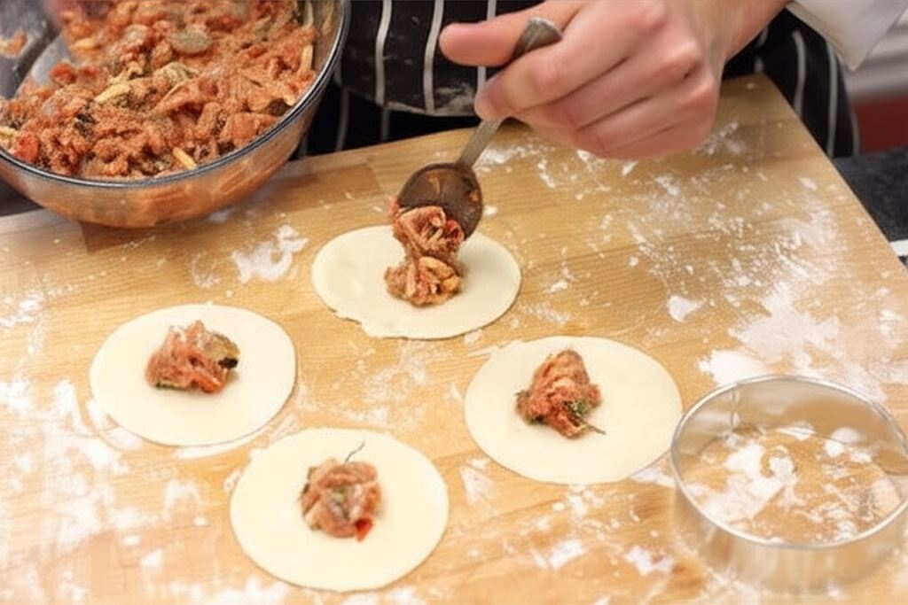 Nadzienie umieść na rozwałkowanych plackach ciasta i łącząc brzeg z brzegiem zlepiaj dociskając razem poszczególne krawędzie tak, aby utworzyły sakiewki.
