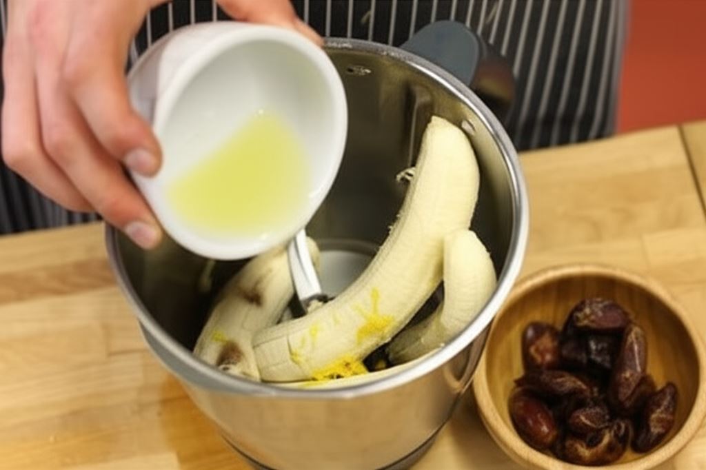 Daktyle, sok i skórkę z cytryny, cztery banany wrzuć do kielicha miksera i starannie zmiksuj na purée. Dwa pozostałe banany potnij w plastry o grubości 0,5 cm.