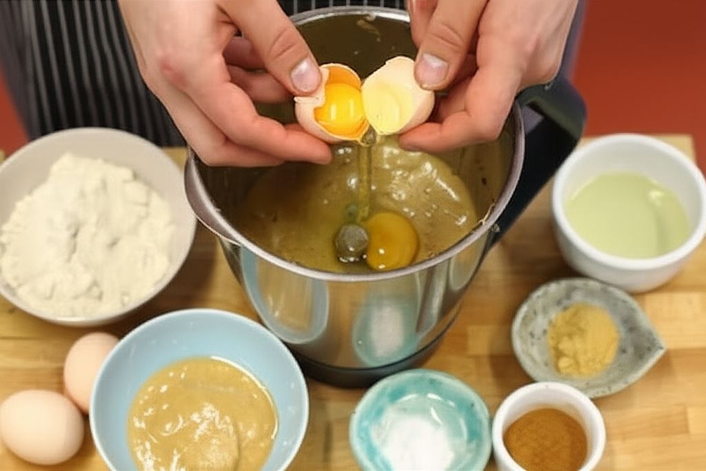 Do musu bananowego wsyp cynamon, imbir, olej, sól, sodę oczyszczoną, masło orzechowe, jaja i mąkę kokosową. Dokładnie wymieszaj.