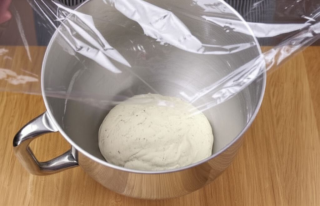 Przy użyciu haka wyrabiaj ciasto, potem dokładnie je zakryj i umieść w lodówce na około 10 godz.