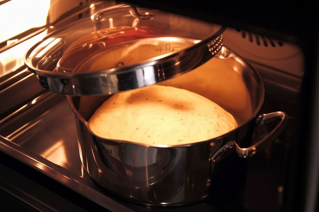Umieść wyrośnięte ciasto w piekarniku nagrzanym do 210 st. C, po 10 minutach obniż temperaturę do 190 st. C, usuń pokrywkę z garnka i kontynuuj pieczenie przez kolejne 40 min.