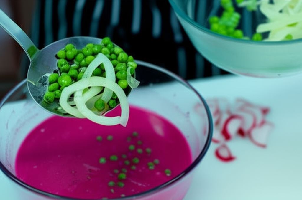 Wymieszaj chłodnik z zimnym jogurtem, wsyp schłodzone warzywa (koper i zielony groszek) oraz dodaj pokrojone rzodkiewki.