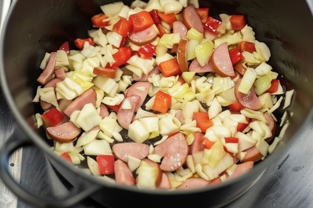 Kiełbasę do chłopskiego garnka podsmażaj na łyżce rozgrzanego oleju. Dodaj cebulę, paprykę i kapustę, i smaż aż uzyskają złoty kolor.
