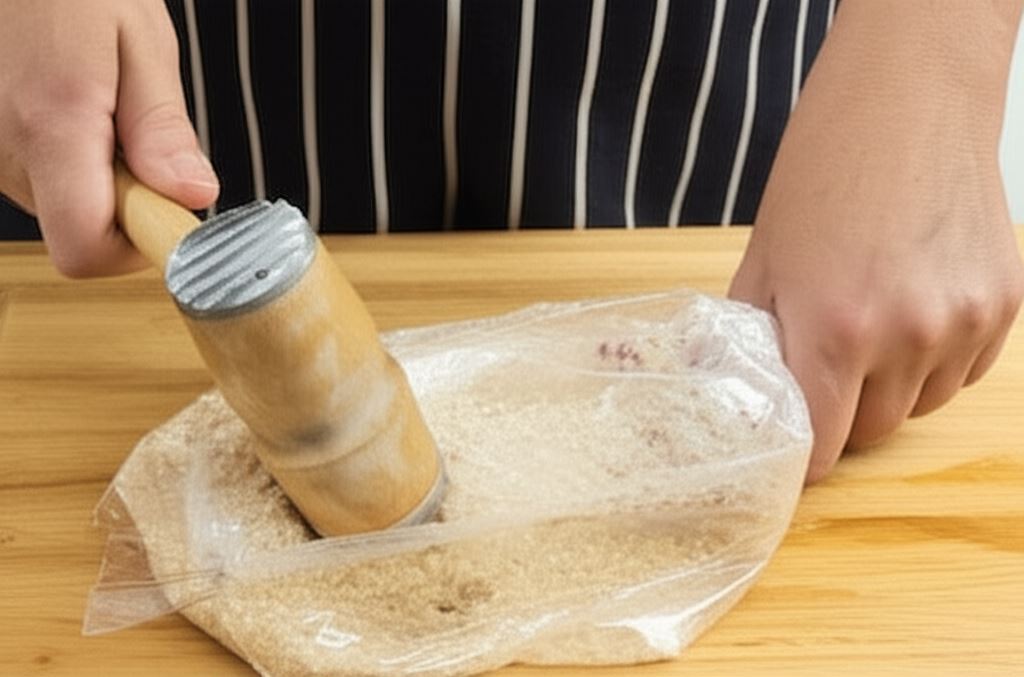 Rozgrzej piekarnik do 200°C. Wyłóż blachę do pieczenia papierem do pieczenia. Wsyp do woreczka płatki i pokrusz za pomocą młotka lub ubijaka do mięsa. Połącz z Przyprawą do złotego kurczaka Knorr.