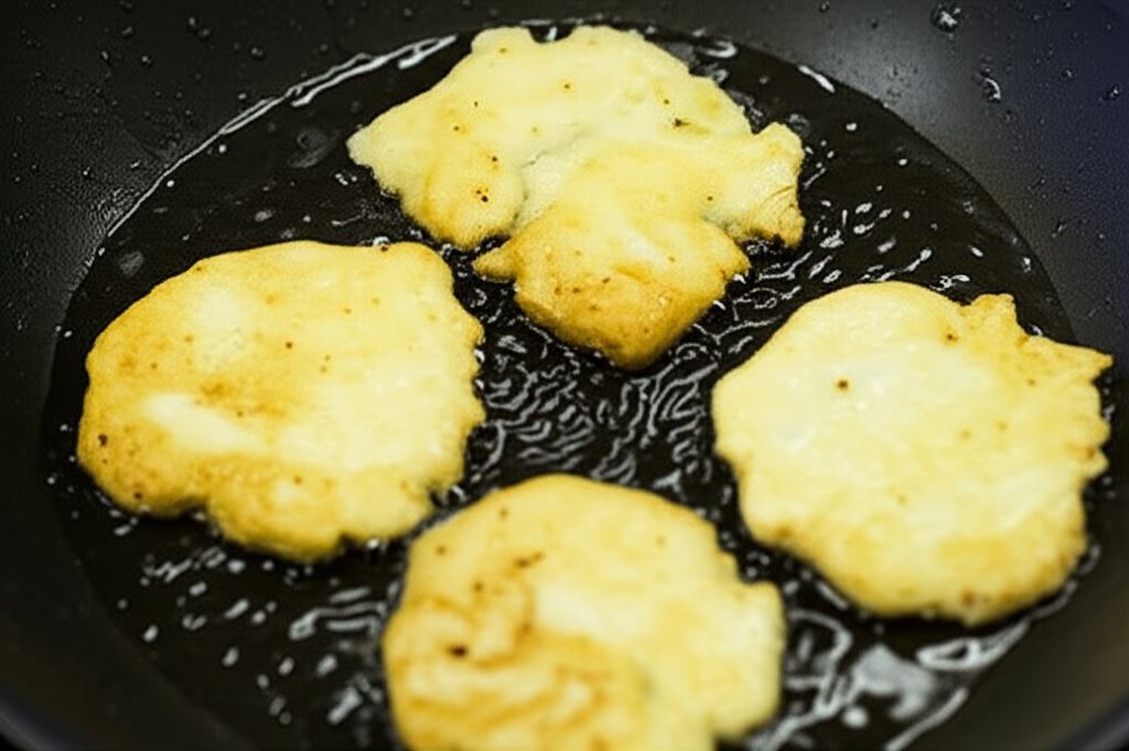 Podgrzej na patelni 150 mililitrów oleju. W tym czasie przyszykuj miskę z ciastem i łyżkę. Kiedy olej stanie się dostatecznie gorący, nakładaj łyżką porcję ciasta na placki. Smaż przez parę minut z obu stron, aż placki uzyskają złoty kolor. Umieszczaj je na talerzu wyłożonym ręcznikiem papierowym, aby odsączyć je z nadmiaru tłuszczu. Skończone!