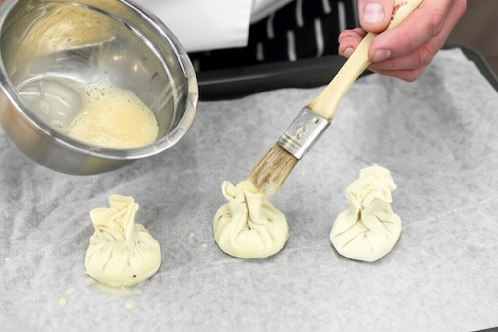 Ułóż przygotowane sakiewki na blasze wyścielonej papierem do pieczenia i posmaruj każdą roztrzepanym jajkiem. Umieść w rozgrzanym do 200°C piekarniku i piecz przez 15 minut.