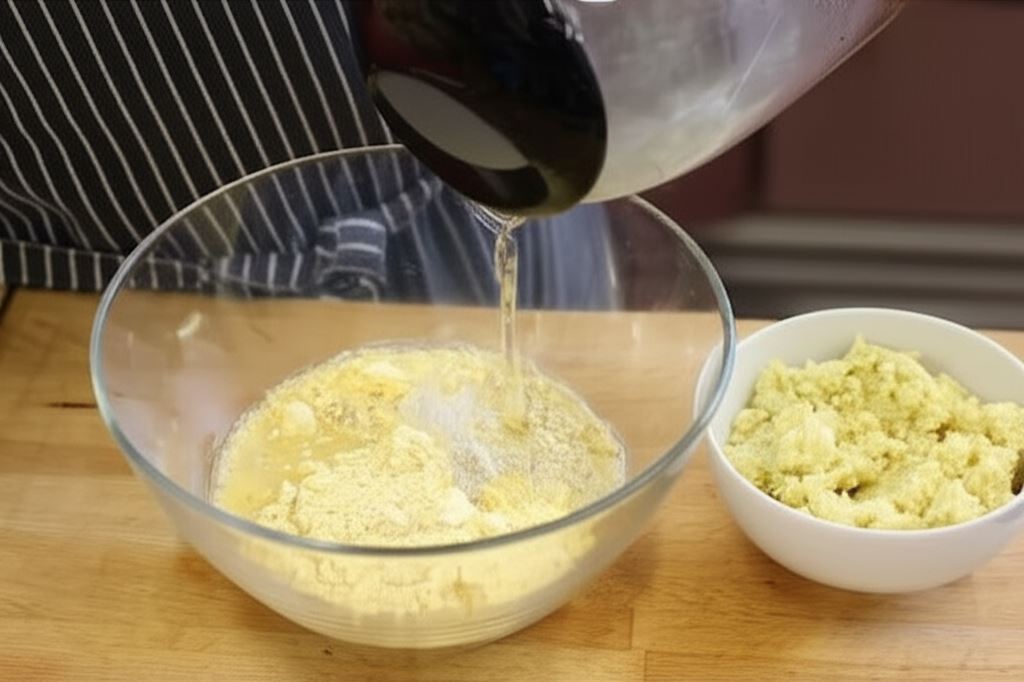 Przygotuj kaszę jaglaną. Mąkę ciecierzycową zalej około 150 ml wrzątku i starannie wymieszaj.