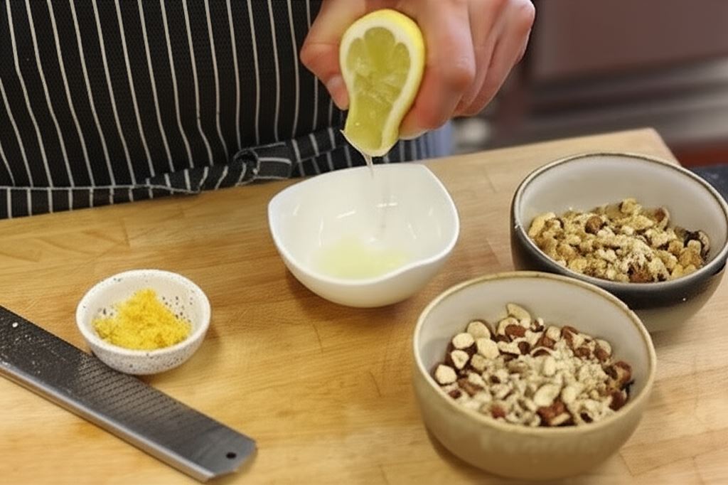 Zgrub posiekaj orzechy nerkowca i włoskie. Cytrynę zalej wrzątkiem, zetrzyj z niej skórkę i wyciśnij sok.