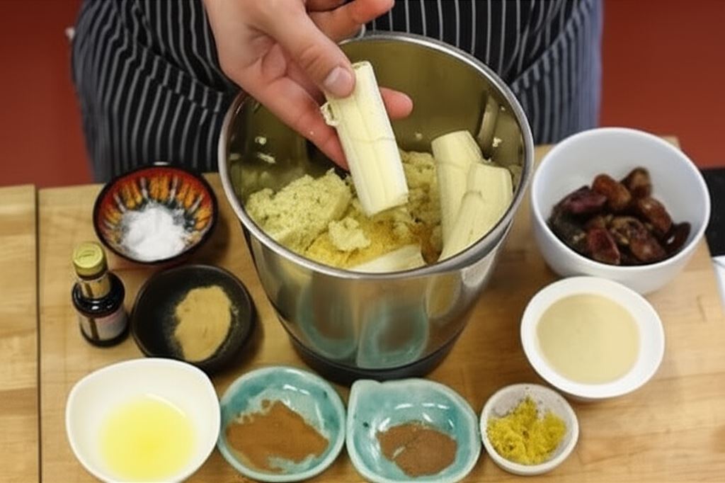 Kaszę jaglaną, opażoną mąkę, masło orzechowe, daktyle, banany, sok i skórkę z cytryny, ekstrakt wanilii, cynamon, imbir, gałkę muszkatołową, odrobinę soli, sodę oraz olej włóż do kielicha miksera i zblenduj niezbyt dokładnie, aby składniki się połączyły albo przepuść przez maszynkę do mielenia.