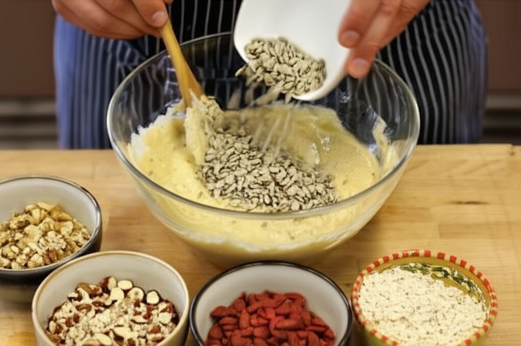 Połącz masę z resztą składników - nasionami goi, ziarnem słonecznika, orzechami nerkowca, płatkami owsianymi i orzechami włoskimi. Mieszanka powinna być dość gęsta.