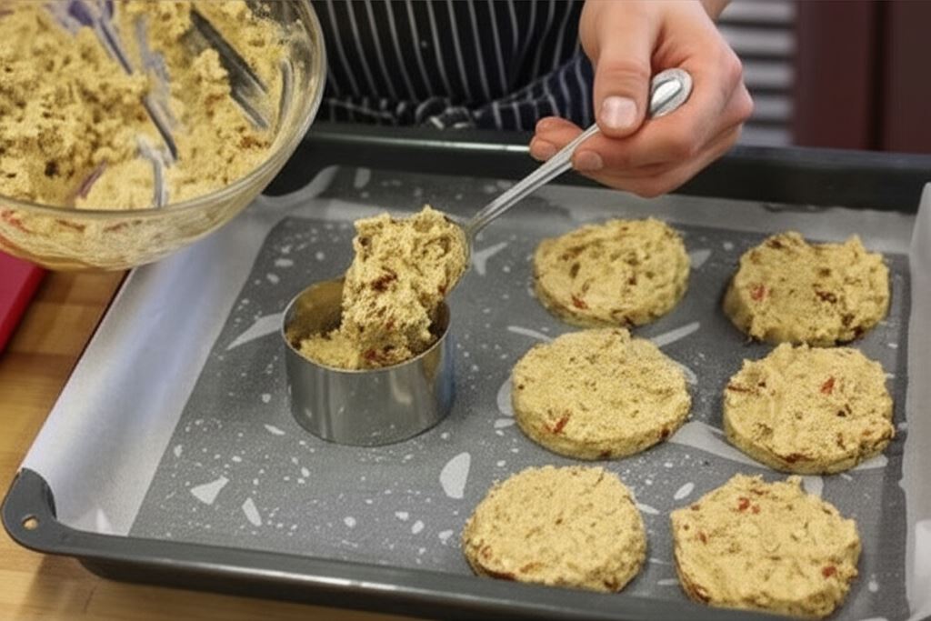 Umieść ją na blasze do pieczenia pokrytej pergaminem, kształtując okrągłe 5-8 cm ciasteczka. Wypiekaj w temperaturze 200°C przez około 25 minut aż ciasteczka nabiorą złotego koloru.