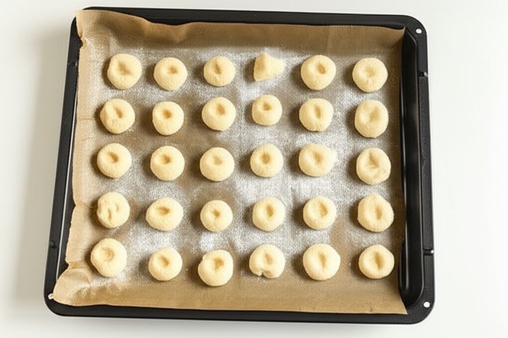 Z ciasta formujemy w dłoniach kulki wielkości orzecha włoskiego. Lekko je rozpłaszczamy, a w środku tworzymy małe wgłębienie. Piekarnik rozgrzewamy do 180 stopni. Blachę wykładamy papierem do pieczenia. Umieszczamy na niej ciasteczka. Ciasteczka wypiekamy przez ok. 15 minut (do zrumienienia).