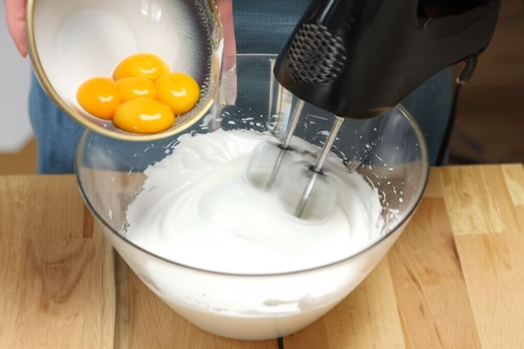 Oddziel białka od żółtek, ubij je na sztywną pianę. Podczas końcowej fazy ubijania dodaj esencję waniliową, stopniowo cukier i żółtka po jednym - cały czas ubijając. Do ubitej masy jajecznej dodaj przesiane obie mąki. Delikatnie połącz składniki za pomocą rózgi kuchennej, aby się zmieszały.