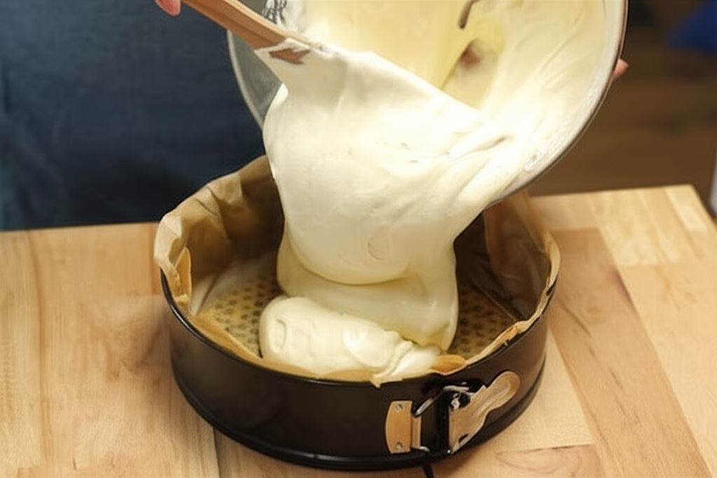 Do wyścielonej papierem do pieczenia formy tortowej przenieś ostrożnie ciasto i wypiekaj w temperaturze 160º C przez około 40 minut. Ciepłe ciasto wyciągnij z piekarnika, z wysokości około 40 cm zrzuć je (w formie) na podłogę i ostudź. Ten zabieg powoduje, że biszkopt nie opada.