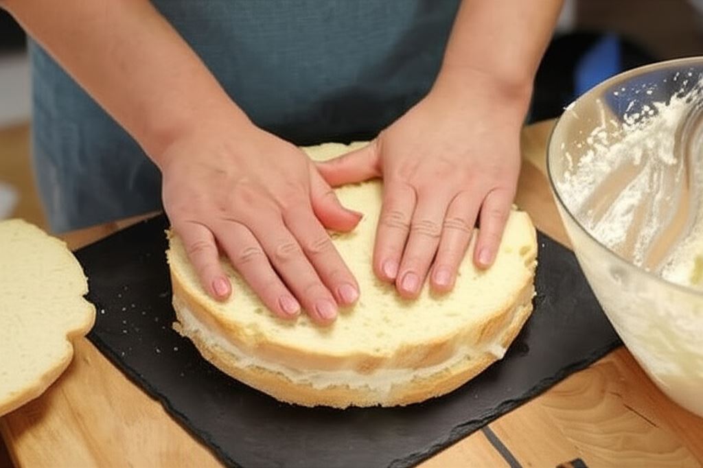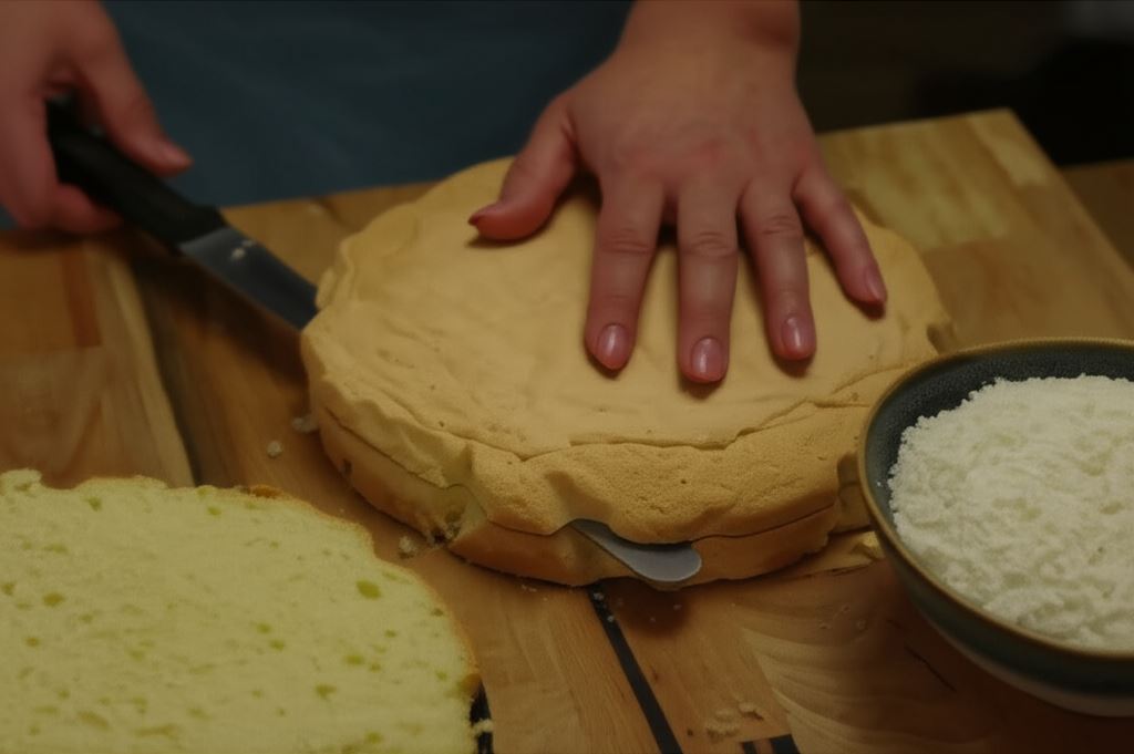 Połącz wiórki kokosowe z esencją waniliową. Ostrym nożem ostrożnie przekrój biszkopt wzdłuż na trzy okrągłe warstwy.