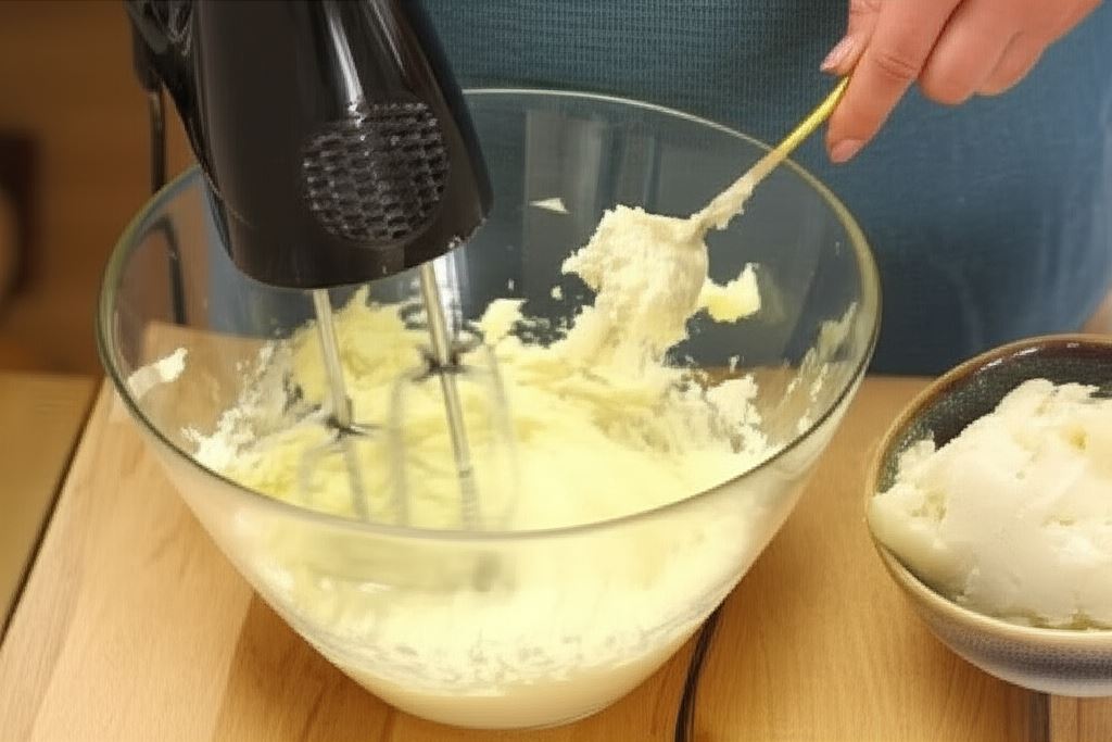 Wytrzepaj mikserem masło, po czym, kontynuując miksowanie, zacznij wsypywać budyń. Wsyp 150 g wiórków kokosowych i wymieszaj.
