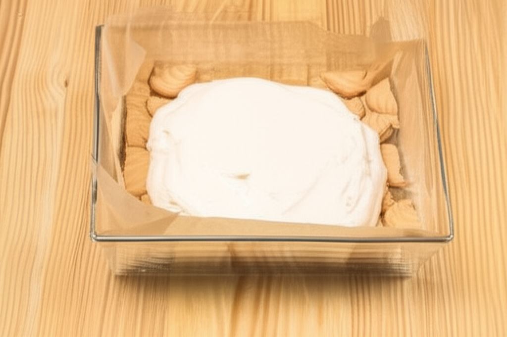 Przygotuj formę o wymiarach 25cm x 30cm. Wyściel spód i brzegi papierem do pieczenia. Na spodzie umieść pierwszą warstwę herbatników, potem pokryj kremem śmietankowym i umieść kolejną warstwę herbatników.