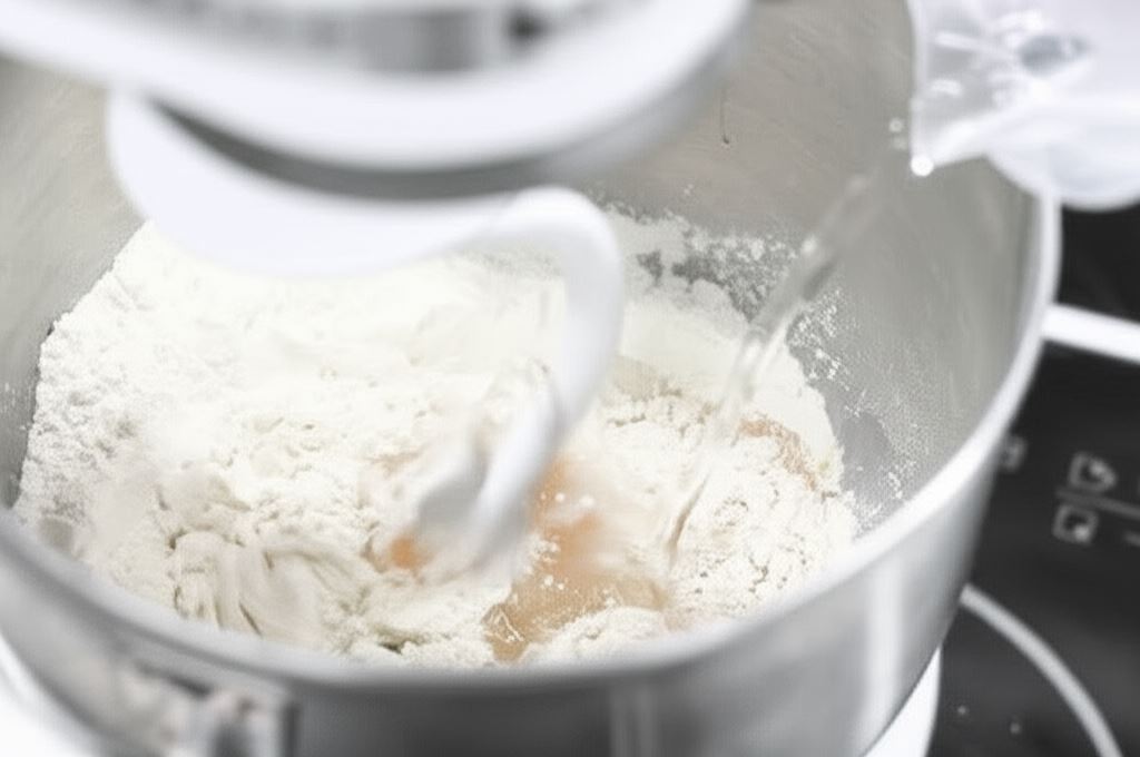 Wsyp jaja, żółtko, wodę i sól. Mieszaj ciasto przez około 10 minut, dopóki nie stanie się gładkie.