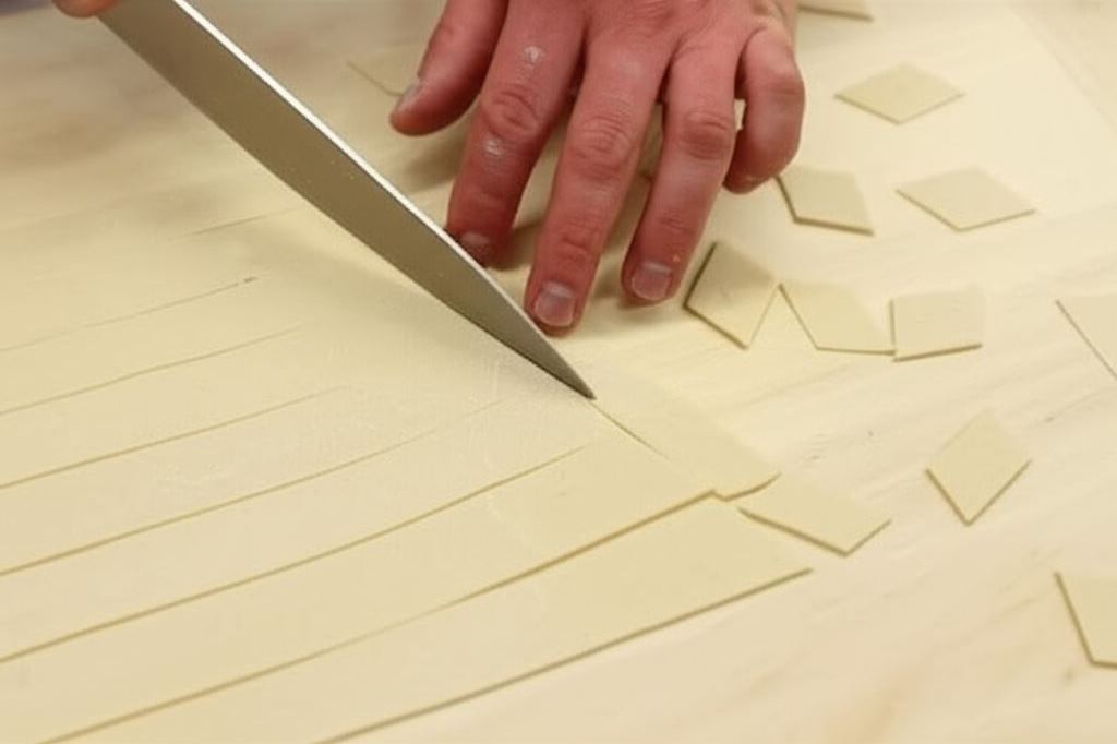 Rozciągnij ciasto na maksymalnie cienką warstwę. Przy użyciu noża wykonaj nacięcia wzdłuż ciasta, potem w poprzek na krzyż, aby utworzyć małe romby. Odstaw ciasto do wyschnięcia.