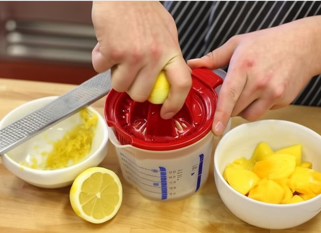 Cytryny opłucz, zalej wrzątkiem, zetrzyj skórkę i wyciśnij sok. Mango obierz, wyciągnij pestkę.