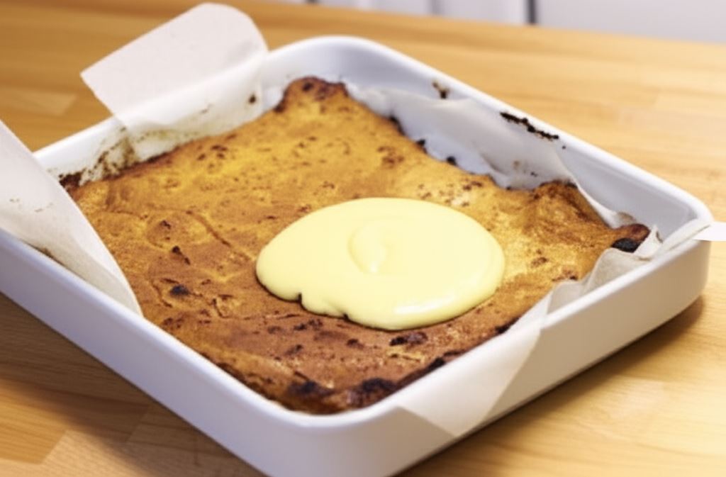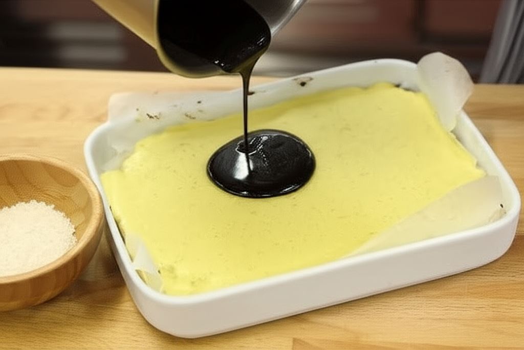 Umieść ciasto w prostokątnej formie wyłożonej papierem do pieczenia, włóż do rozgrzanego do 180°C piekarnika na około 30 minut. Następnie ciasto pozostaw do ostygnięcia.