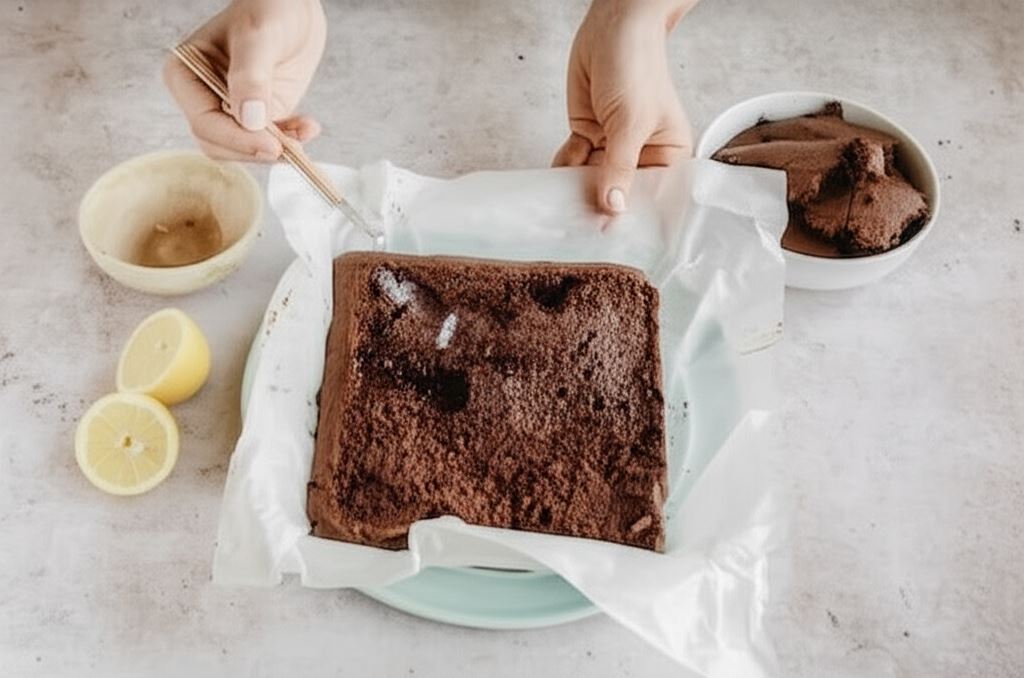 Wystudzony biszkopt wyciągamy z formy, wyrównujemy górę przy użyciu noża i z powrotem umieszczamy w formie. Wodę z sokiem cytrynowym łączymy razem i nasączamy tym biszkopt.