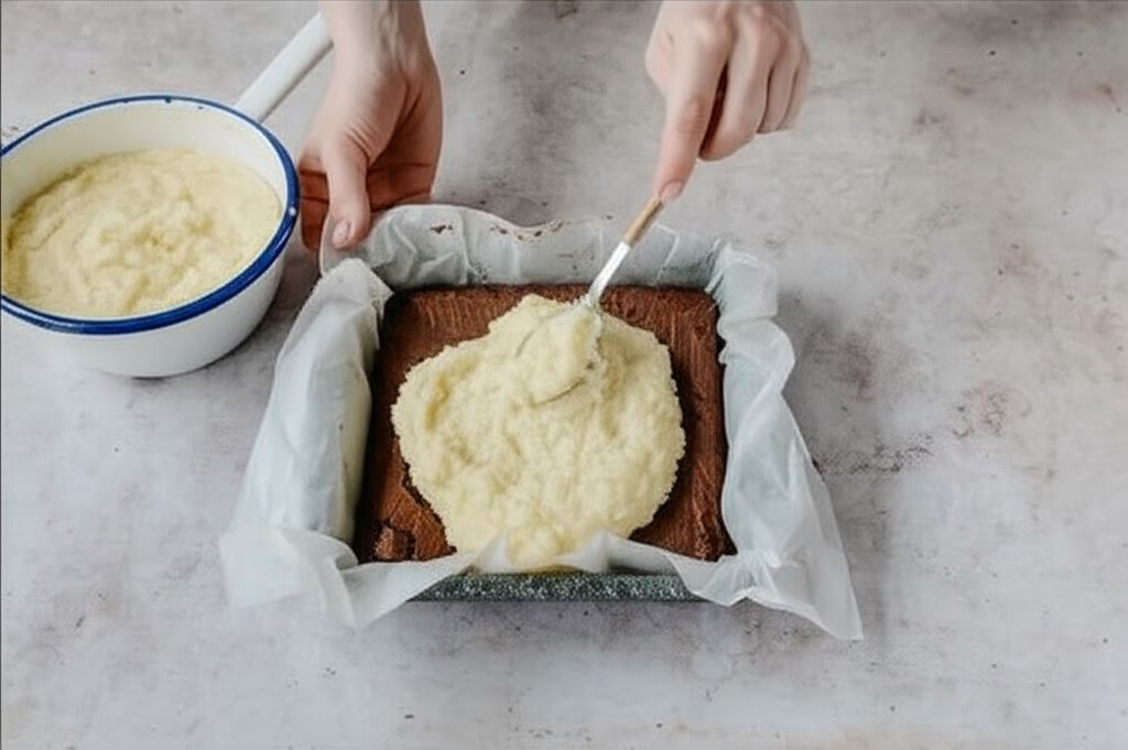 Mieszamy, dopóki masa jeszcze bardziej zgęstnieje. Ciepłą mieszankę kokosową wylewamy na biszkopt, wyrównujemy i odstawiamy do ostygnięcia.
