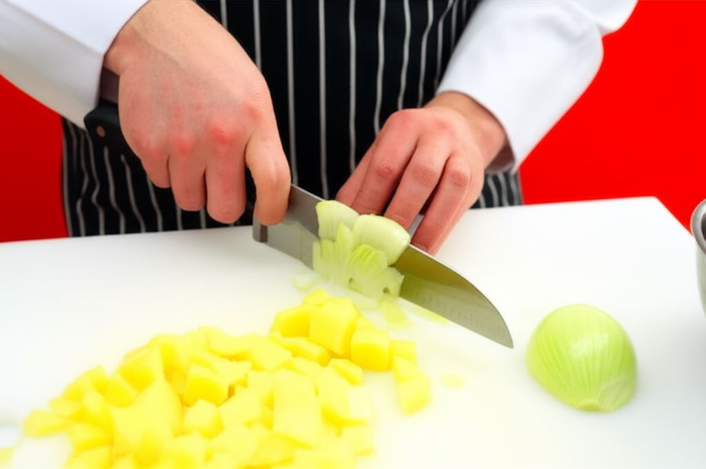 Pokrój obrane ziemniaki i cebulę w drobną kostkę. Przepuść czosnek przez praskę.