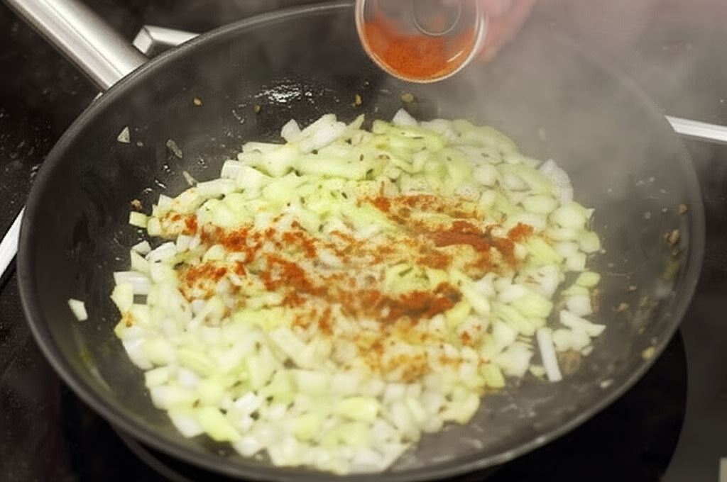 Teraz wsyp cebulę, czosnek i chili i smaż, dopóki cebula nie uzyska lekko brązowego koloru.