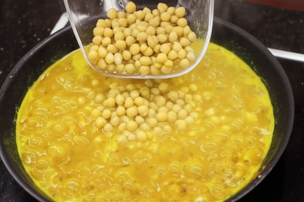Gdy ziemniaki zaczynają mięknąć wsyp ciecierzycę. Jeżeli wody jest zbyt mało, to dolej jej. Kiedy ziemniaki będą miękkie rozgnieć parę z nich, aby sos zrobił się gęstszy. Podawaj z indyjskim chlebem ozdobione zmielonym kuminem.