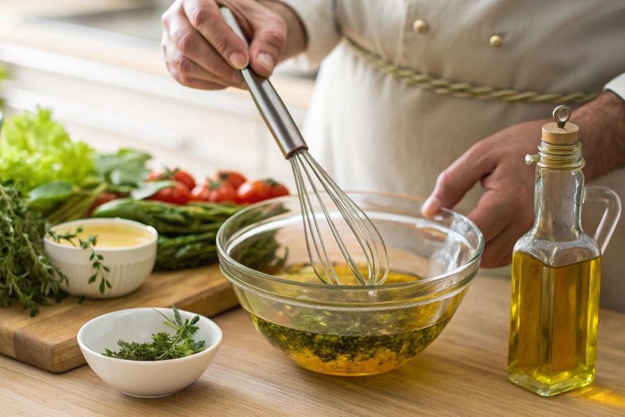 Przygotowanie klasycznego sosu winegret rozpoczyna się od dokładnego wymieszania składników bazowych w odpowiednich proporcjach. W tradycyjnej metodzie najpierw łączymy 3 części oliwy z oliwek z 1 częścią octu winnego lub soku z cytryny w głębokiej misce. Dodajemy szczyptę soli, pieprzu i opcjonalnie łyżeczkę musztardy diżońskiej, która działa jako naturalny emulgator.