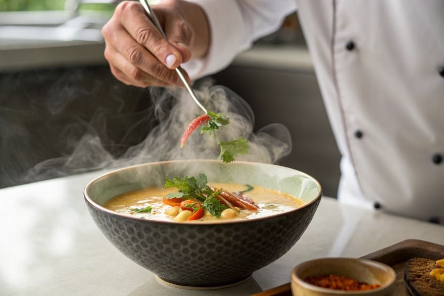 Do kremowych zup kokosowych najlepiej pasują przyprawy takie jak kurkuma, curry, imbir, limonka, kolendra, trawa cytrynowa oraz chili. Zioła takie jak bazylia tajska, mięta czy kolendra świeża dodają świeżości i podkreślają egzotyczny charakter dania. Nowoczesne trendy kulinarne z 2025 roku wskazują na rosnącą popularność łączenia mleka kokosowego z lokalnymi, sezonowymi warzywami oraz eksperymentowanie z dodatkiem fermentowanych składników, jak kimchi czy miso, które wzbogacają profil smakowy zupy.