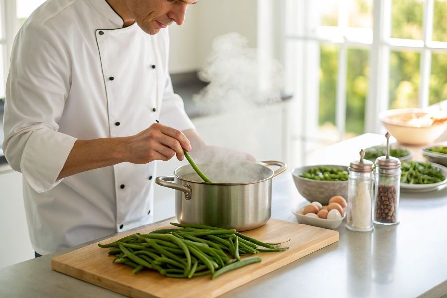 Fasolka szparagowa zachowuje intensywniejszy kolor i więcej składników odżywczych, gdy gotujemy ją w dużej ilości wody z dodatkiem szczypty soli morskiej przez 5-8 minut, w zależności od preferowanej tekstury.