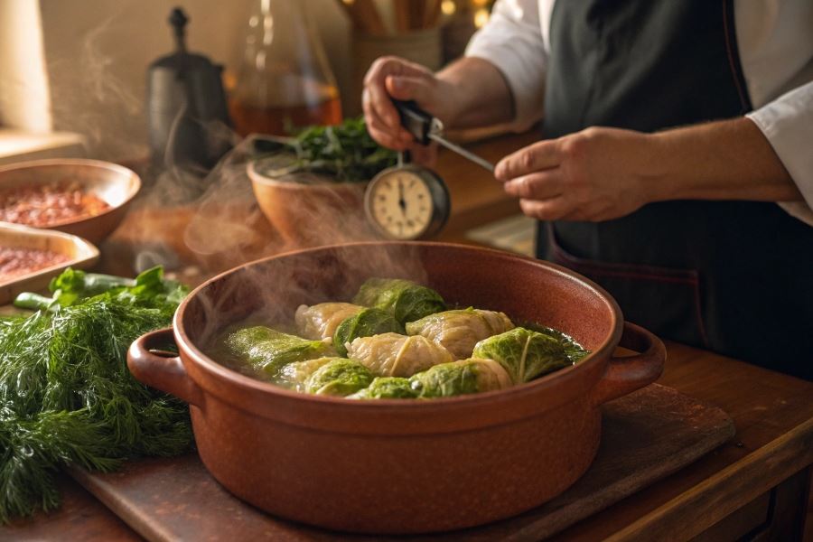 - Przezroczystość liści kapusty – prawidłowo ugotowane liście kapusty stają się półprzezroczyste i miękkie