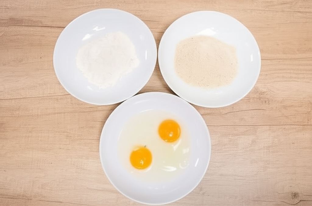 W trzech miseczkach przygotuj mąkę, bułkę tartą oraz w trzecim naczyniu roztrzep i połącz jaja.