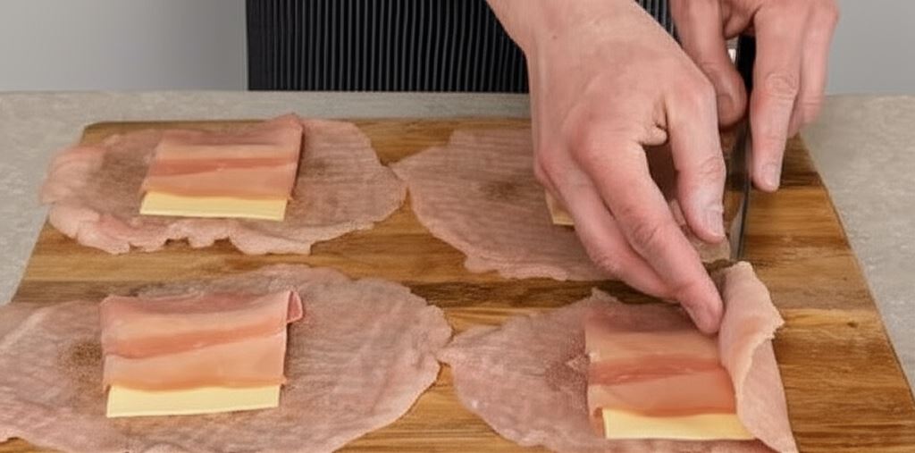 Cordon Bleu to prawdziwa uczta dla podniebienia! Ten klasyczny kotlet szwajcarski kryje w sobie smakowitą niespodziankę – roztapiający się ser i aromatyczną szynkę zamknięte w soczystym mięsie. Przygotowanie rozpoczynamy od dokładnego rozbicia plastrów mięsa o grubości 1,5 cm, które wcześniej oczyściliśmy z błon i tłuszczu. Po delikatnym doprawieniu solą i pieprzem, na środek każdego płata układamy plaster sera i szynki, a następnie zawijamy krawędzie do środka, formując zgrabny prostokąt.