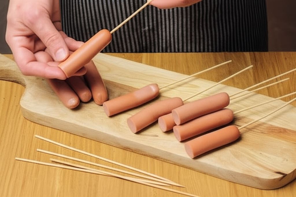 Zdejmij folię z parówek, przekrój je na połowę i nadziewaj wzdłużnie na drewniane wykałaczki. Uważaj, aby nie przekłuć ich na wylot, gdyż podczas smażenia mogą ześlizgiwać się z patyczków.