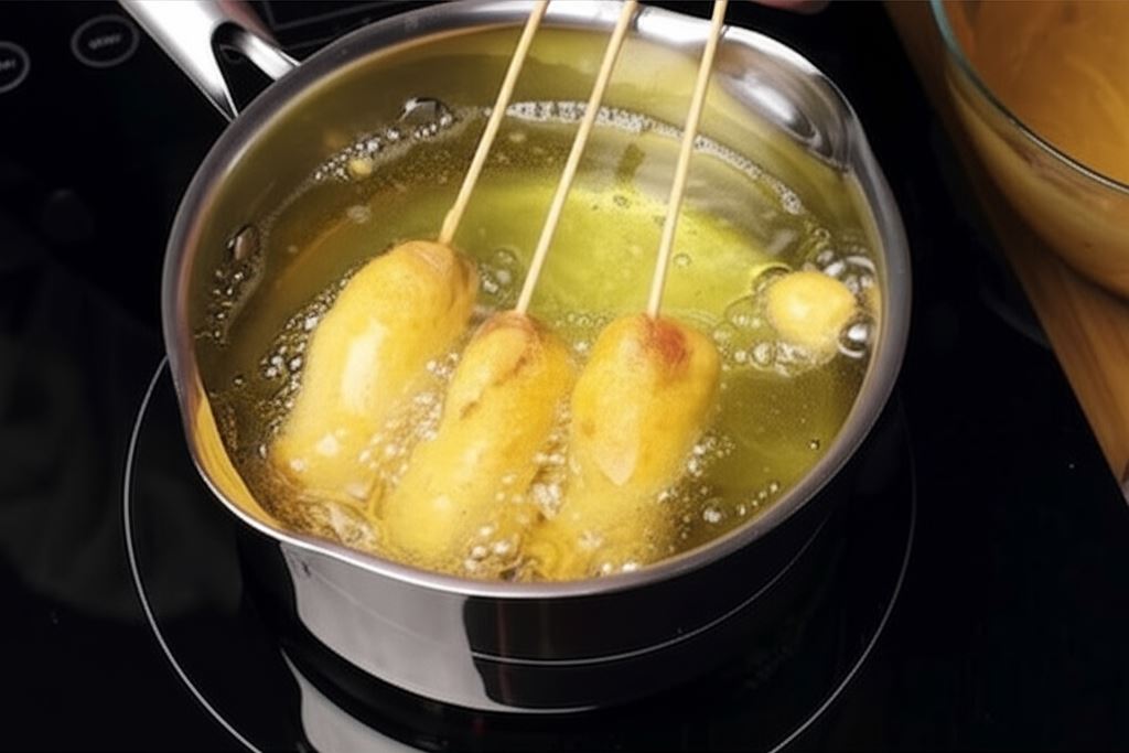 W wąskim lecz dość wysokim garnku porządnie rozgrzej olej. Jego temperaturę możesz sprawdzić używając termometru kuchennego lub zanurzając suchą końcówkę drewnianej łyżki – jeśli wokół trzonka tworzą się bąbelki powietrza, to oznaka, że można rozpocząć smażenie potrawy. Wszystkie szaszłyki z parówek obtocz starannie w cieście i natychmiast smaż na głębokim oleju aż do uzyskania złotego koloru.