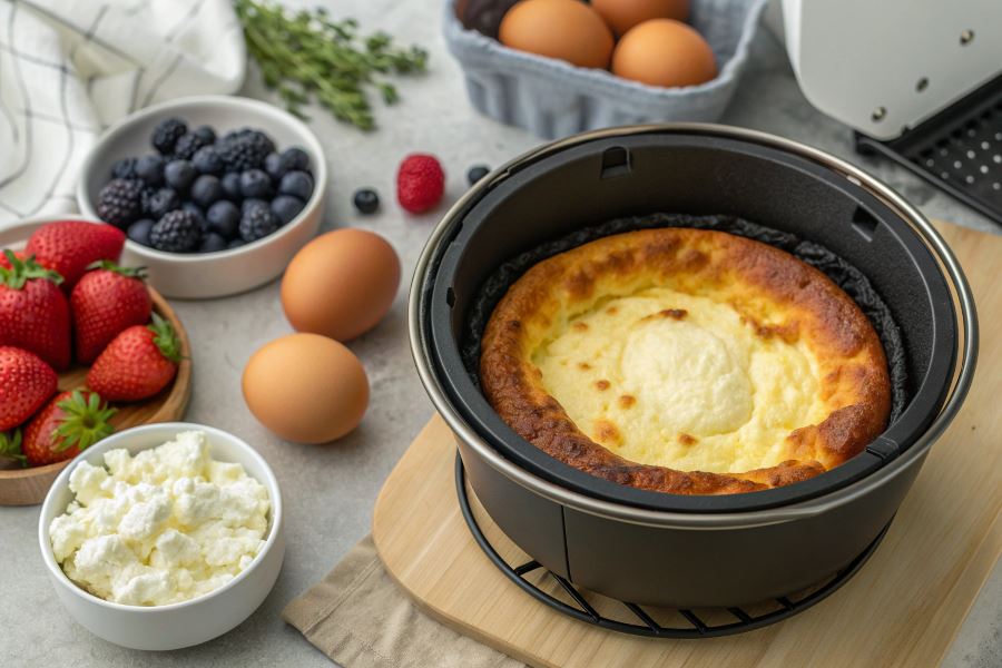 Formę do airfryera należy wyłożyć papierem do pieczenia i lekko natłuścić. Masę twarogową wylewamy do formy, wyrównujemy powierzchnię i wstawiamy do nagrzanego urządzenia. Kluczem do sukcesu jest niższa temperatura i dłuższy czas pieczenia – dzięki temu zapiekanka równomiernie się ścina, zachowując kremową konsystencję w środku.