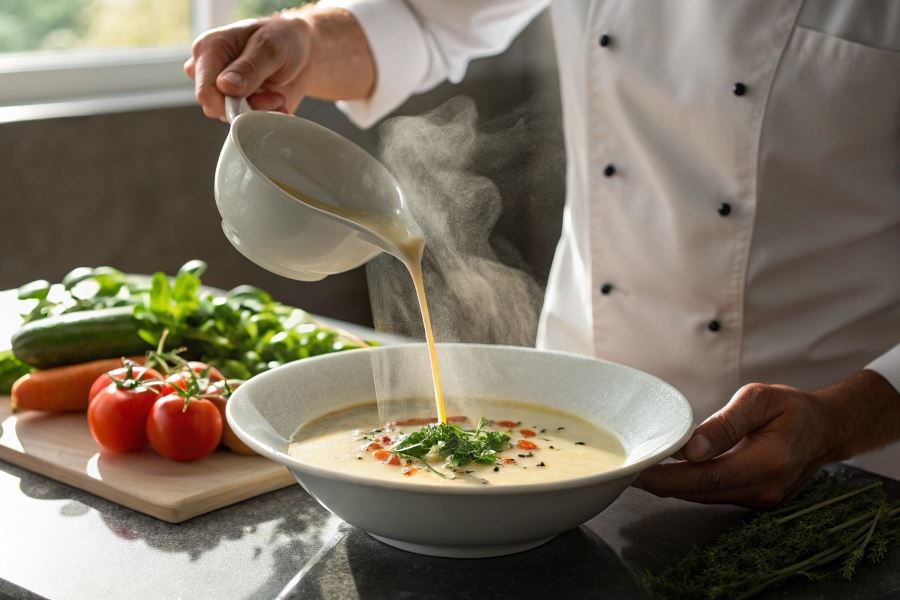 Profesjonalna prezentacja zupy krem to nie tylko kwestia estetyki, ale również smaku. Kontrastujące dodatki podnoszą walory smakowe – do dyniowej dodaj prażone pestki, do pieczarkowej chrupiące grzanki z tymiankiem, a do pomidorowej kulki mozzarelli.