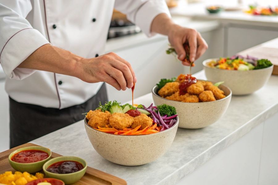 Nuggetsy drobiowe to nie tylko przekąska, ale doskonała baza do przygotowania pełnowartościowych posiłków. Bowls z nuggetsami zyskują popularność dzięki łatwości przygotowania i możliwości personalizacji. Wystarczy ułożyć podsmażone nuggetsy na bazie z ryżu, quinoa lub kaszy, dodać ulubione warzywa, sos i gotowe. Koreańskie bowle z nuggetsami to hit 2025 roku – wystarczy połączyć nuggetsy z kimchi, sezamem i sosem gochujang.